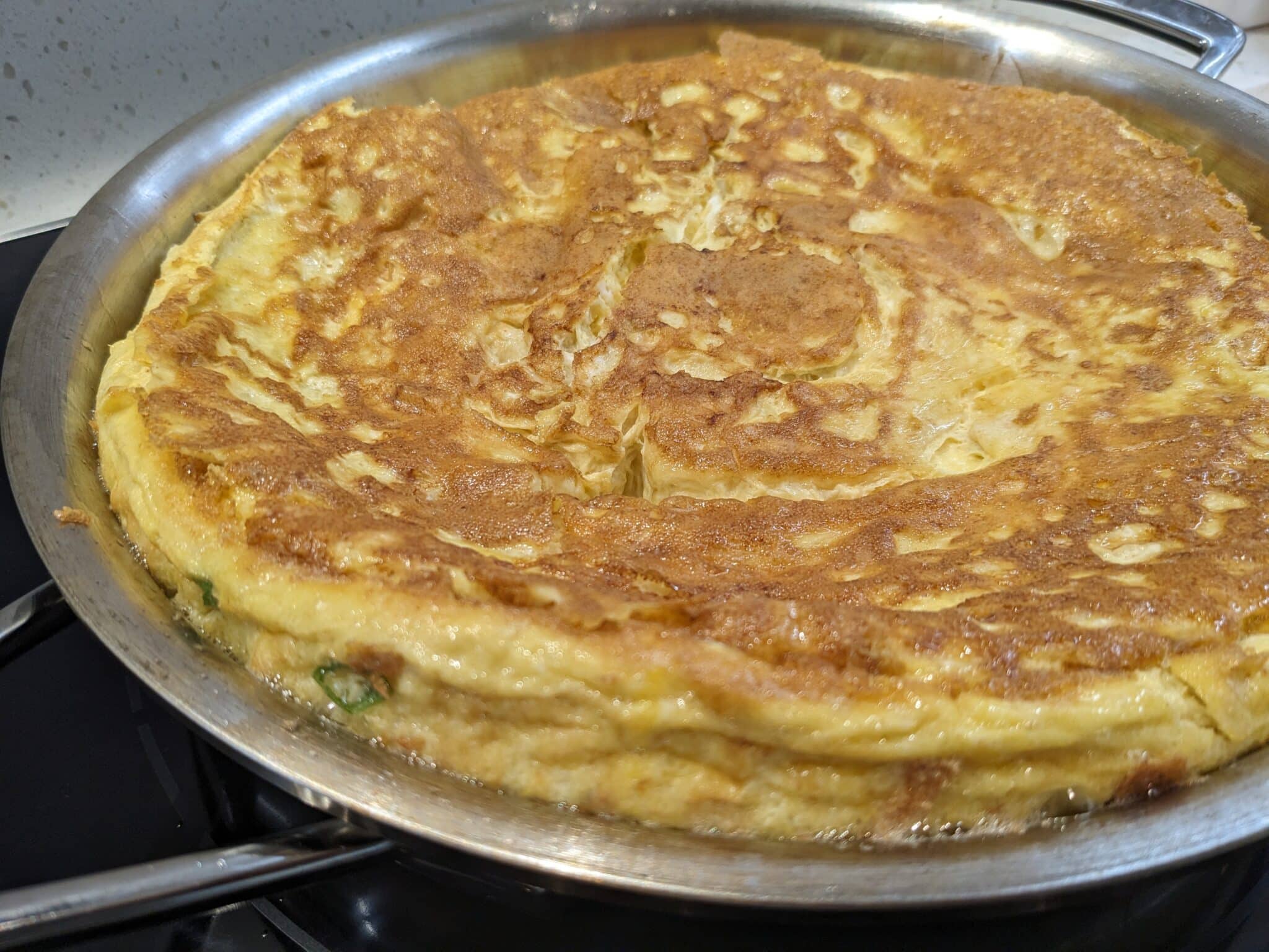 This is what it looks like after it is flipped. It rises a bit, hence “soufflé”.